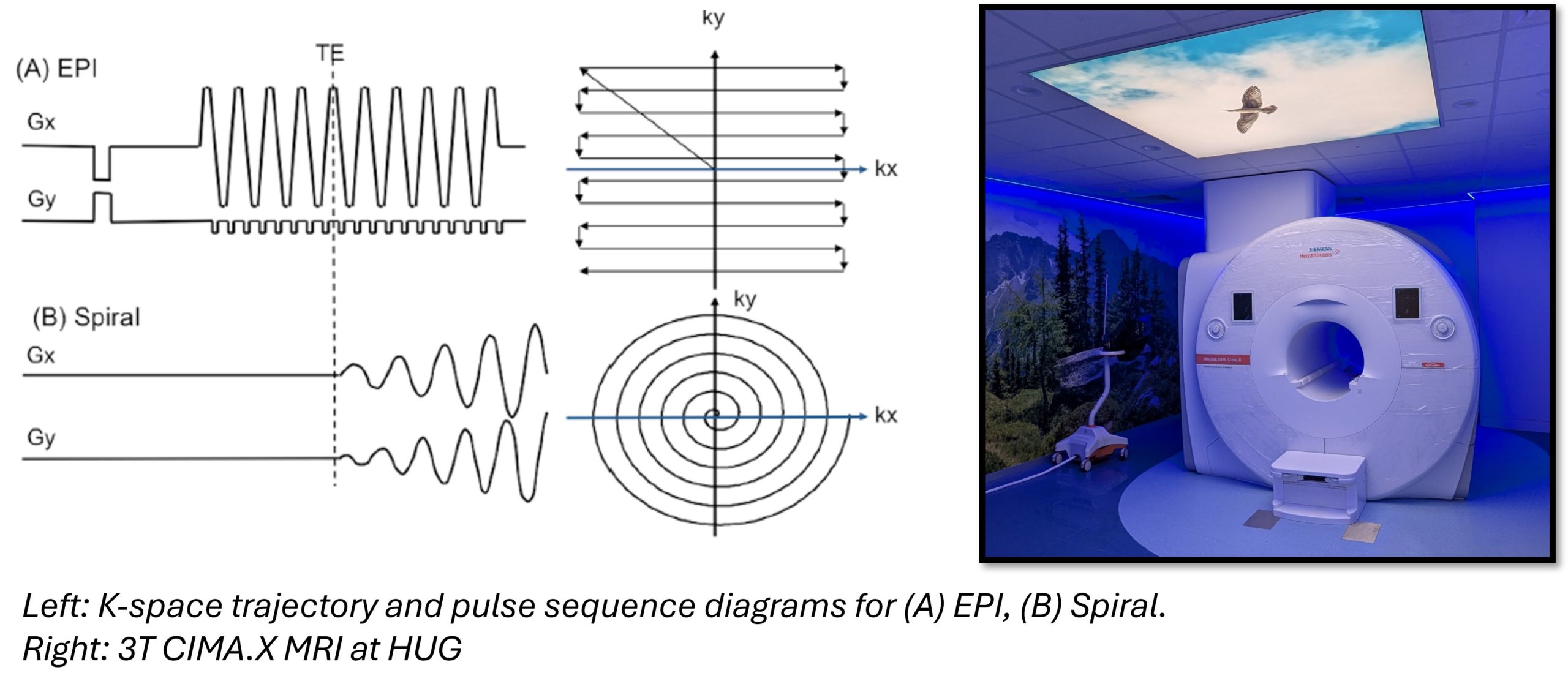 This project, conducted in collaboration with Siemens Healthineers, evaluates the quality of functional MRI acquired using spiral imaging compared to the standard Echo-Planar Imaging (EPI). fMRI relies on subtle T2*-weighted signal changes that are highly sensitive to motion and acquisition speed. While EPI is widely used, it is prone to distortions, whereas spiral trajectories may provide higher resolution and improved contrast but require more demanding gradient performance. With new high-performance gradient systems, these limitations can now be reconsidered. The project includes reviewing spiral fMRI literature, adapting existing analysis pipelines, generating and comparing activation maps from spiral and EPI data, and assessing the benefits and drawbacks of spiral imaging. It involves hands-on acquisitions on the new 3T Cima.X scanner at HUG.